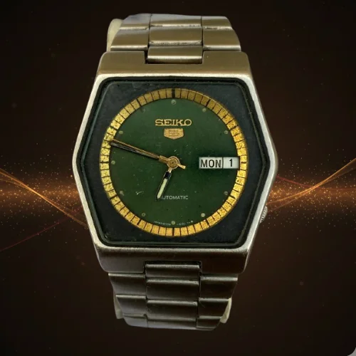 Make a statement with this rare Seiko 5 featuring a vibrant green dial and a unique hexagonal stainless steel case. Boasting a golden textured inner ring and the reliable 6309 automatic movement, this “Japan Made” vintage timepiece is the perfect blend of 1970s funk and mechanical durability.